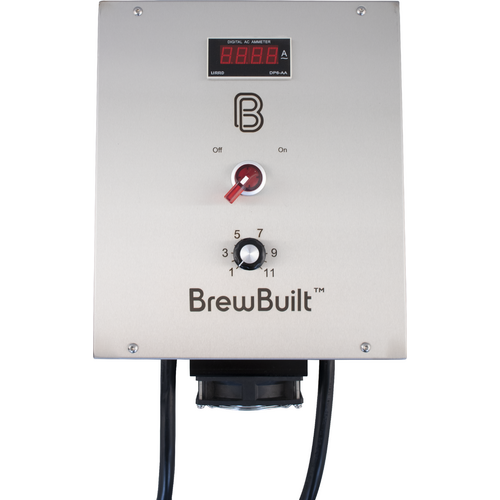 The BrewBuilt™ Boil Vigor Controller allows you to control the current of 208-240V heating elements up to 30 amps. Perfect for dialing down a boil or adjusting the heat input to a still wash pot. The controller works by adjusting the percentage of power delivered to the heating element. The power is increased in a linear fashion from 0 to 100% as you adjust the dial from 1 to 11. Features industrial-style power switch, dial knob, and digital display mounted on a splash resistant stainless steel enclosure. Precut mounting holes for attaching the controller to a brew stand or mounting on the wall. L6-30 connections with 4 ft. cords on either end.