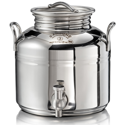 The Sansone Europa-AQ model Fusti tank is made from 304 stainless steel with a mirror polish finish and welded handles. Compared to the standard Europa model, the AQ model undergoes an additional pickling and polishing process. This process improves corrosion resistance, which is key for continuous use, especially in commercial settings like wine bars, taprooms, and coffee shops that might use the tank as a self-service water station.