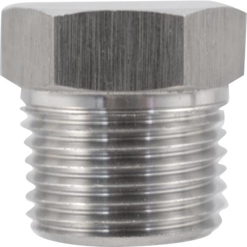 1/2" MNPT Plug. Made from a solid chunk of stainless that has been machined down. Nicer looking finish and hefty feel when compared to most plugs. Uses a 7/8" wrench.